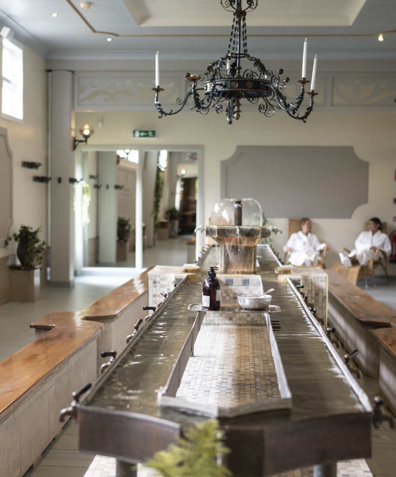 Vi har valt inredning och produkter med naturen i åtanke. Här ska du kunna hitta ro och avkoppling precis som forna tiders besökare gjorde. Att sänka sig ned i ett av våra gjutjärnsbadkar från 1800-talet och omslutas av doften av tallbarr, citron och rosmarin – vår egen signaturdoft – får de mest spända axlar att sjunka ner.